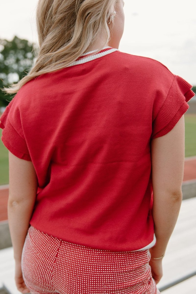 Get ready for game day in style with our Red Gameday Tinsel Knit Top! This stunning top features short flutter sleeves and a stretchy, knit fabric for maximum comfort. The bold red and white design, rounded neckline, and "Gameday" embroidered in tinsel on the front make it the perfect choice for any Alabama roll tide fan. Show your team spirit and look fabulous at the same time!