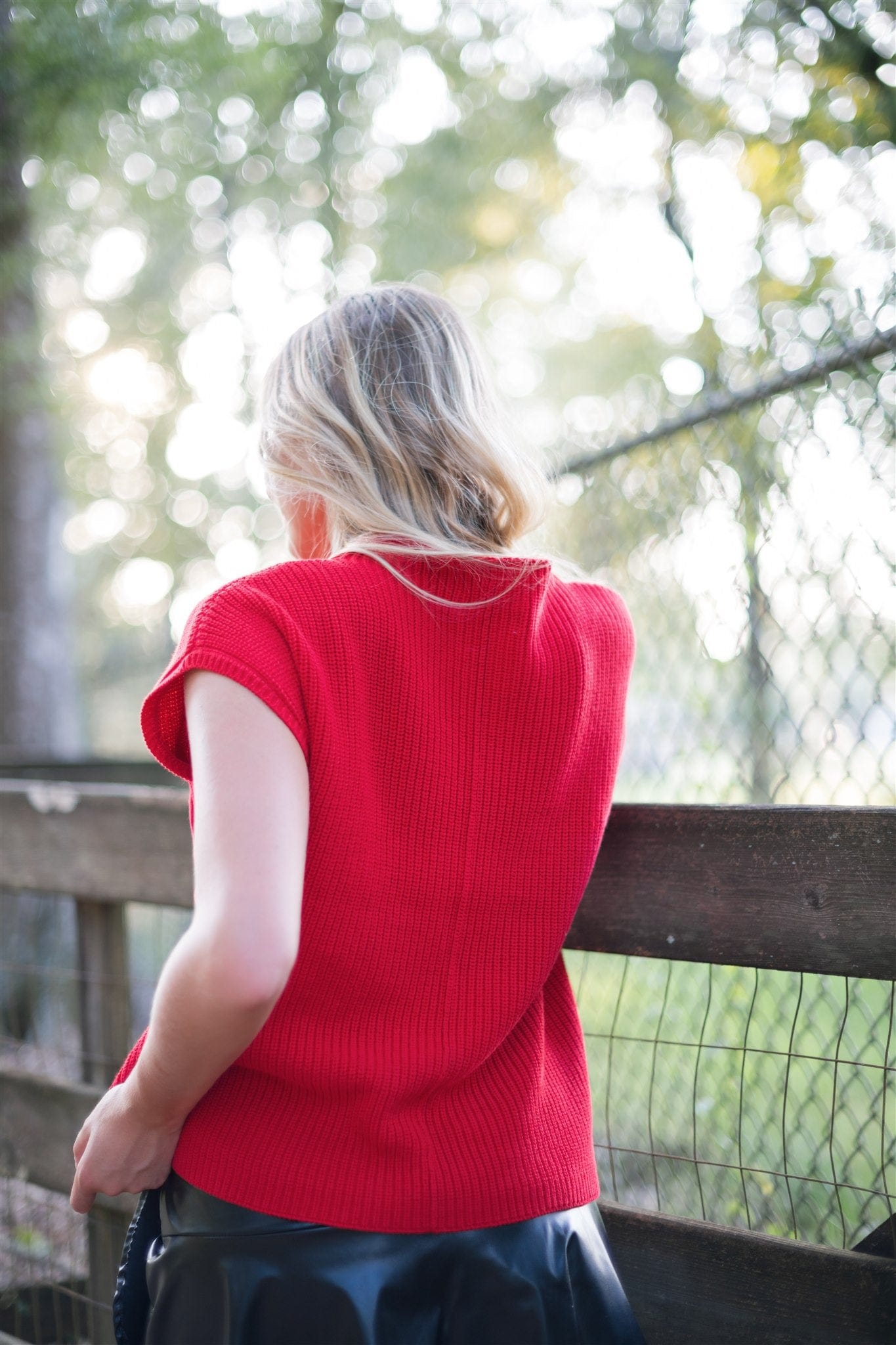 Elevate your fall wardrobe with this red mock neck short sleeve knit top. Crafted from stretchy knit fabric, it offers a comfortable, flattering fit that moves with you. The mock neck adds a touch of sophistication, while the short sleeves keep it versatile for layering or wearing alone. Perfect for crisp autumn days, this top combines style and comfort effortlessly.