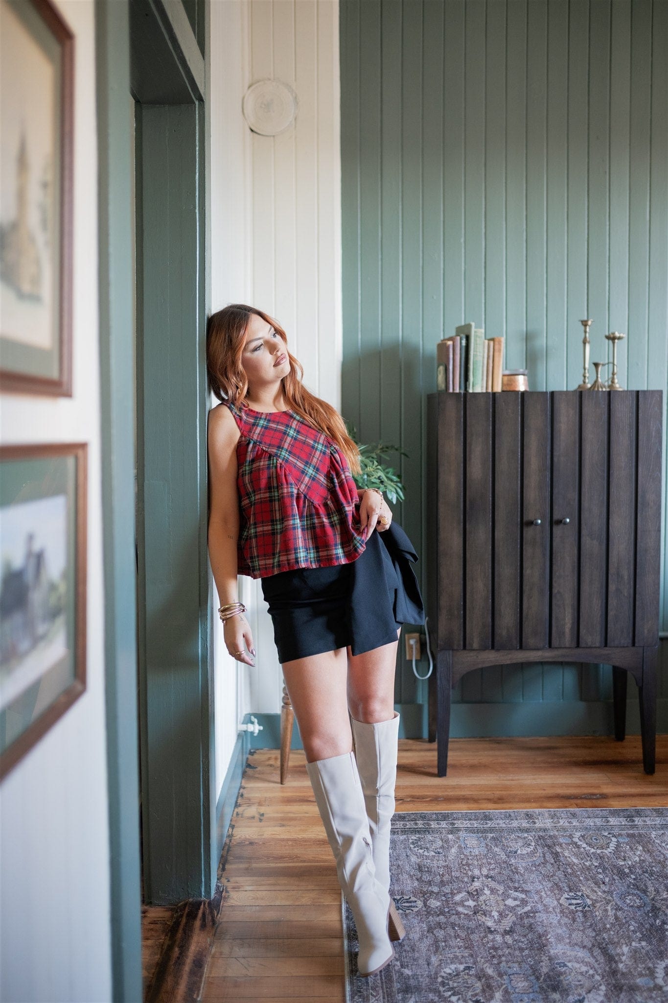 Celebrate the holiday season in style with this Red Plaid Sleeveless Babydoll Top. Featuring a flattering rounded neckline and a flowy, comfortable fit, it’s perfect for festive gatherings. The button-back closure adds a charming touch while ensuring easy wear. Embrace the classic Christmas plaid print that effortlessly captures holiday spirit, making this top a must-have for your seasonal wardrobe.