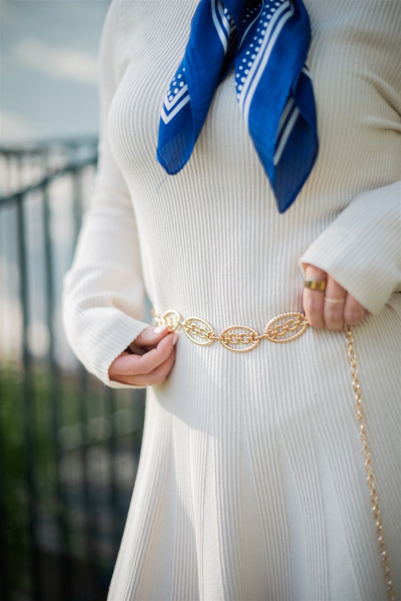 This chain belt adds a modern rope accent oval style. Immerse yourself in the world of understated glamour as this chain belt effortlessly exudes timeless appeal.