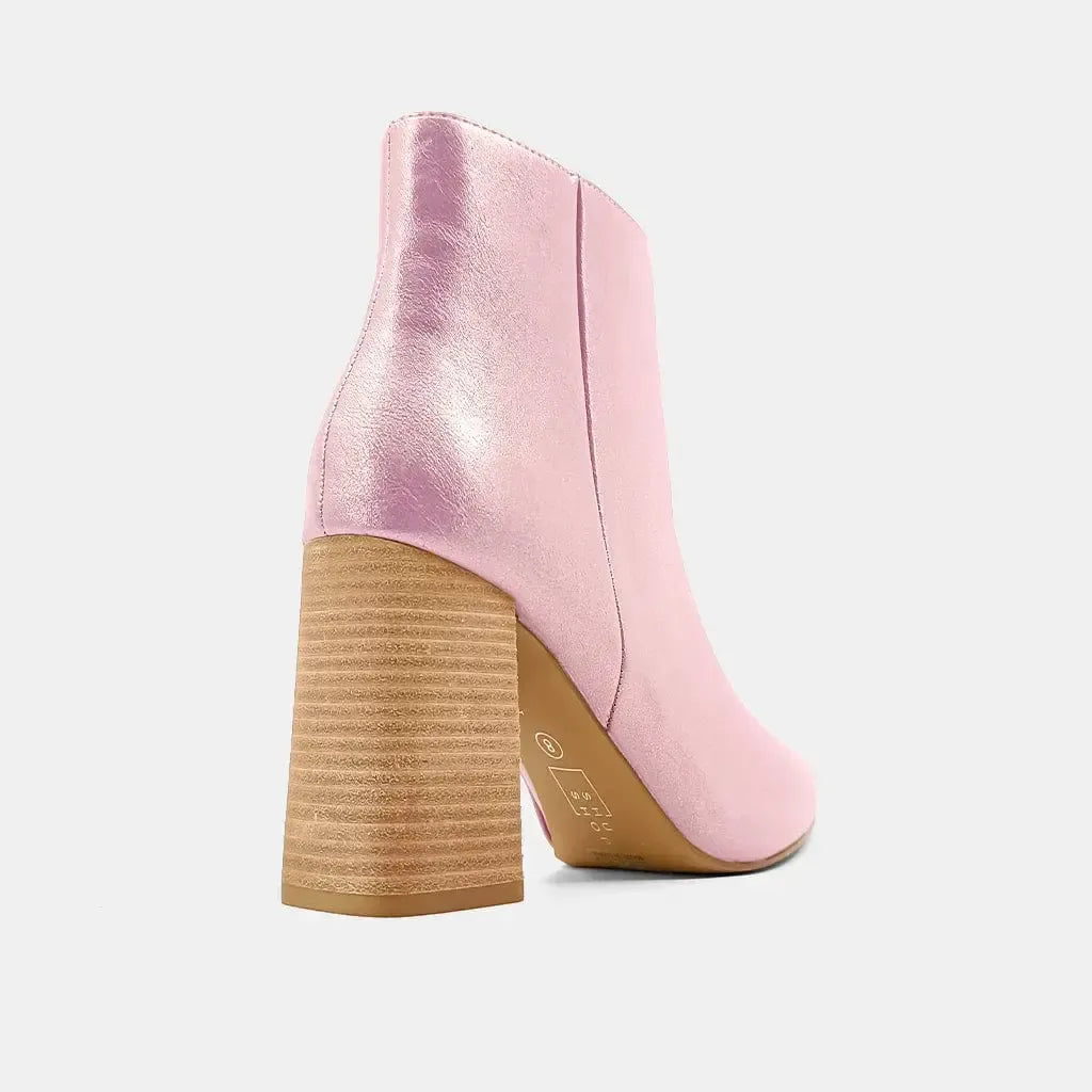 Stay ahead of the trend with the Shu Shop Pink Metallic Veronica Bootie. A statement piece crafted in metallic pink faux leather with a 3 1/2" stacked wood heel, this season-spanning shoe is sure to turn heads. Show off your bold style and order with confidence because this one runs true to size and everyone will ask, "Where did you get those fabulous shoes?"