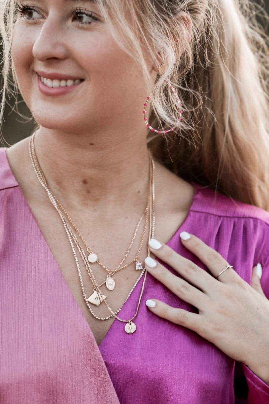 Every layer is about the stars on our Star Nite Layered Necklace. The 16" long cable chain has three details: rhinestones, a gold medallion star and an emerald cut CZ to attract the eye. Move down to the 17" length and you have a single star in a diamond-shaped gold-tone medallion. Lastly, two 19" chains - one is the glitz with a simple chain of rhinestones and the other is a box chain with a single North Star. Add the 3" extender chain, and you are covered for the long and short of it!