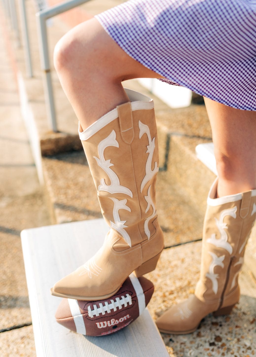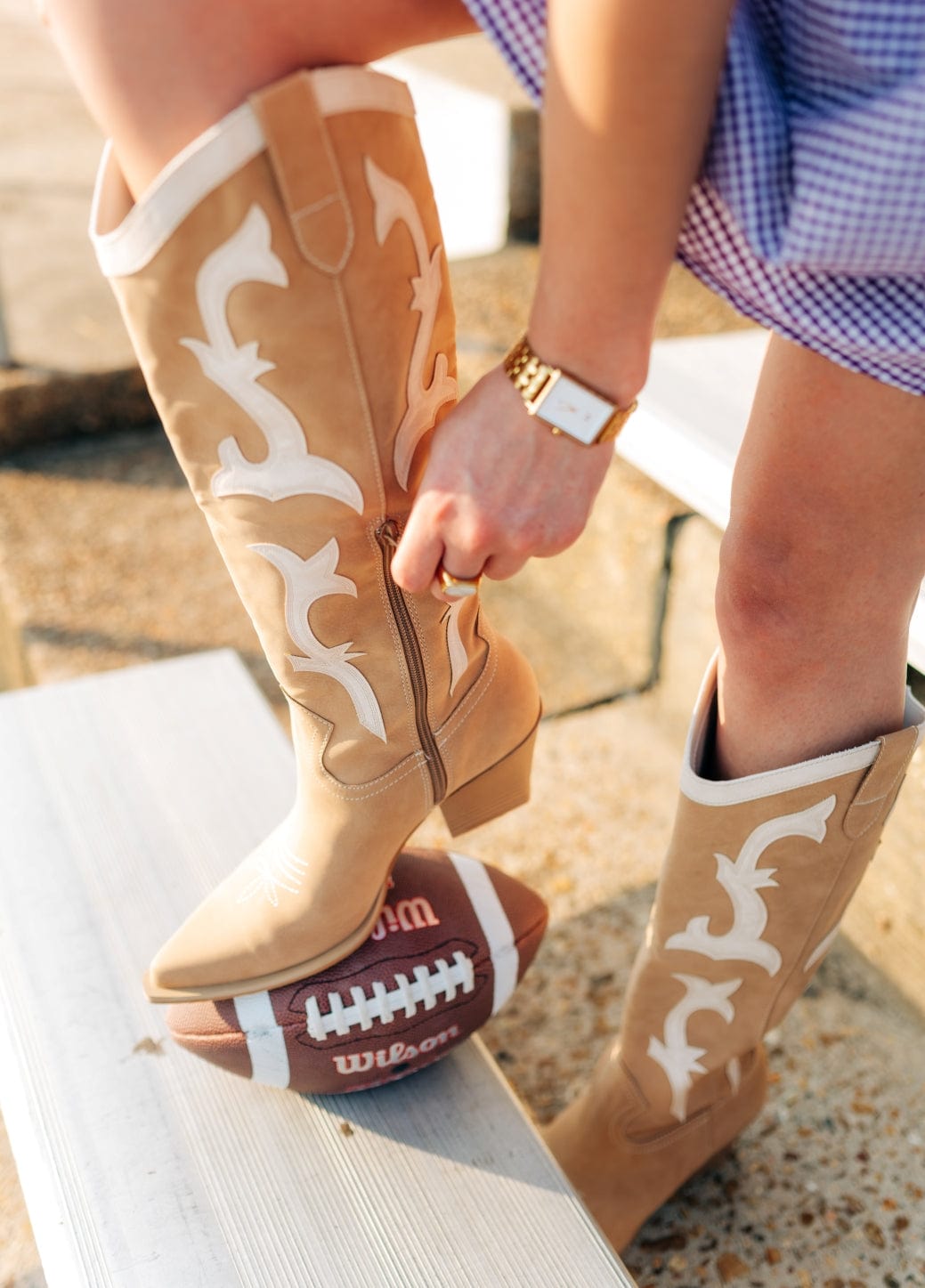 Step into timeless Western elegance with The Adriana Camel Western Boot. These stunning knee-high boots feature a sophisticated camel and white design with a pointed toe that elongates your silhouette. The convenient zip-up closure ensures easy on-off while maintaining that authentic cowgirl aesthetic. Perfect for adding a touch of country charm to any outfit, these boots are designed for the fashion-forward woman who appreciates both style and functionality.