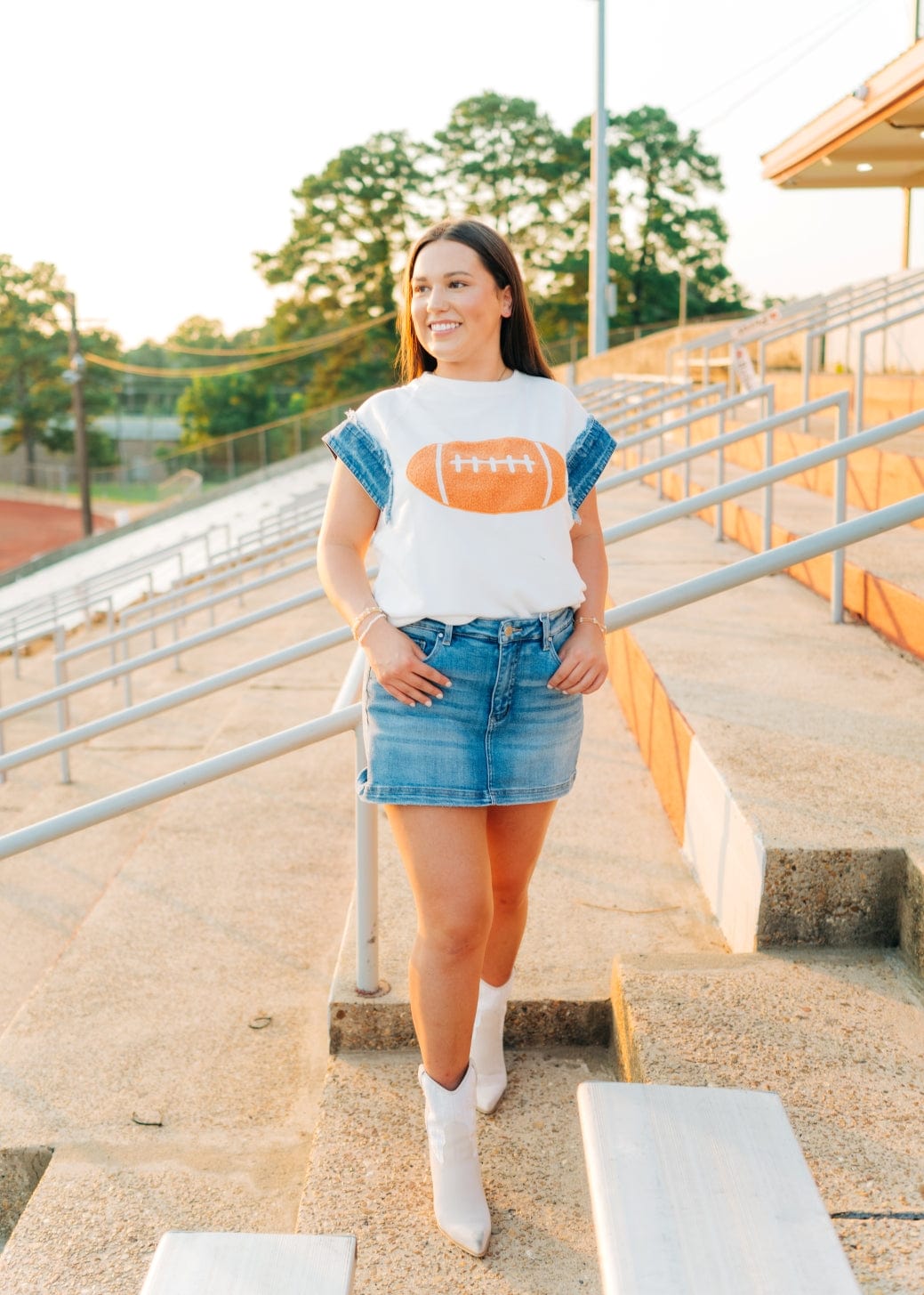 This White Football Patch Denim Edge Top combines sporty style with casual comfort. Featuring a rounded neckline and short sleeves trimmed with denim edges, it offers a unique, trendy look. The stretchy fabric ensures a loose, comfortable fit perfect for game day or everyday wear. Elevate your casual wardrobe with this versatile top that blends classic football charm with modern details.