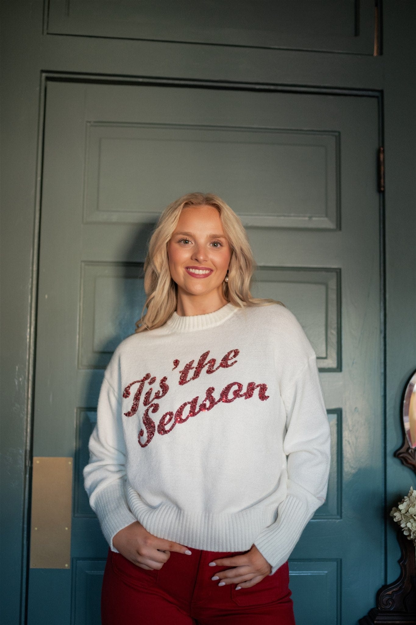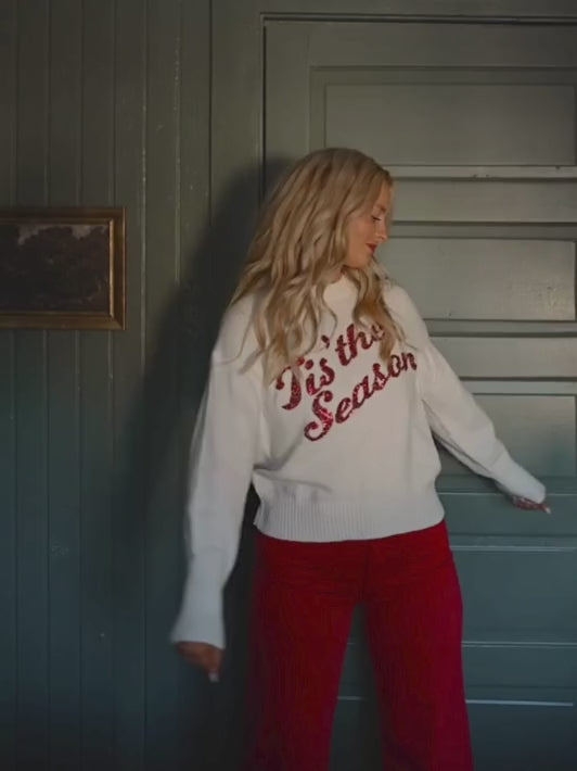 Celebrate the holiday spirit in cozy style with this White 'Tis The Season' Sequin Sweater. Featuring a soft knit fabric, long sleeves, and a comfortable rounded neckline, it offers warmth and comfort for festive gatherings. The shimmering red sequin detail spelling out "Tis The Season" adds a joyful sparkle to your Christmas wardrobe, making it perfect for spreading holiday cheer wherever you go.