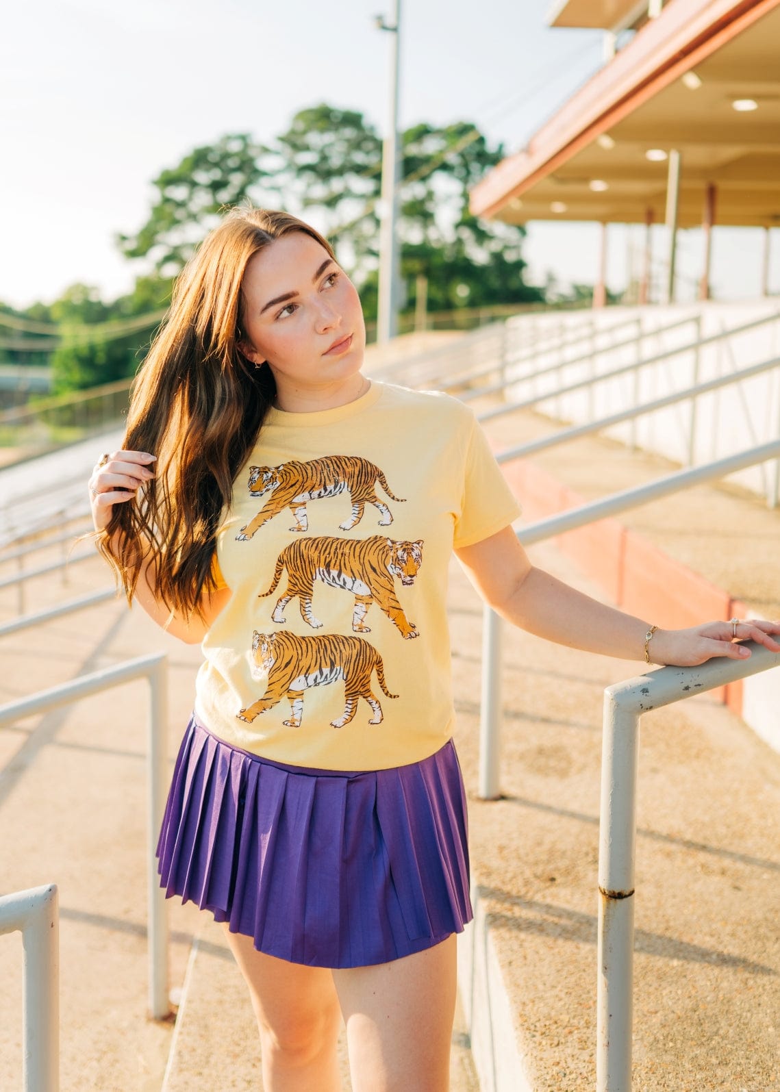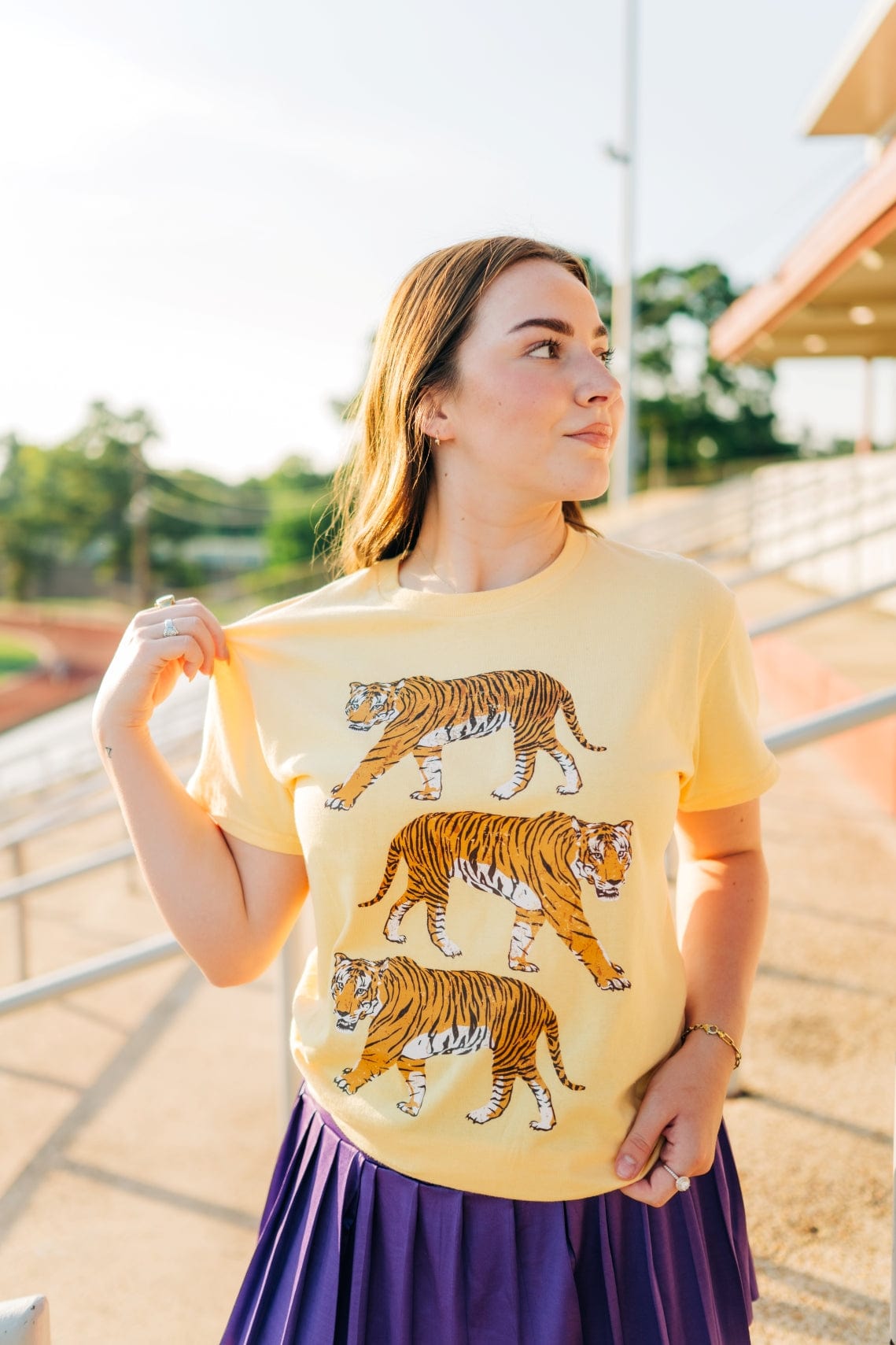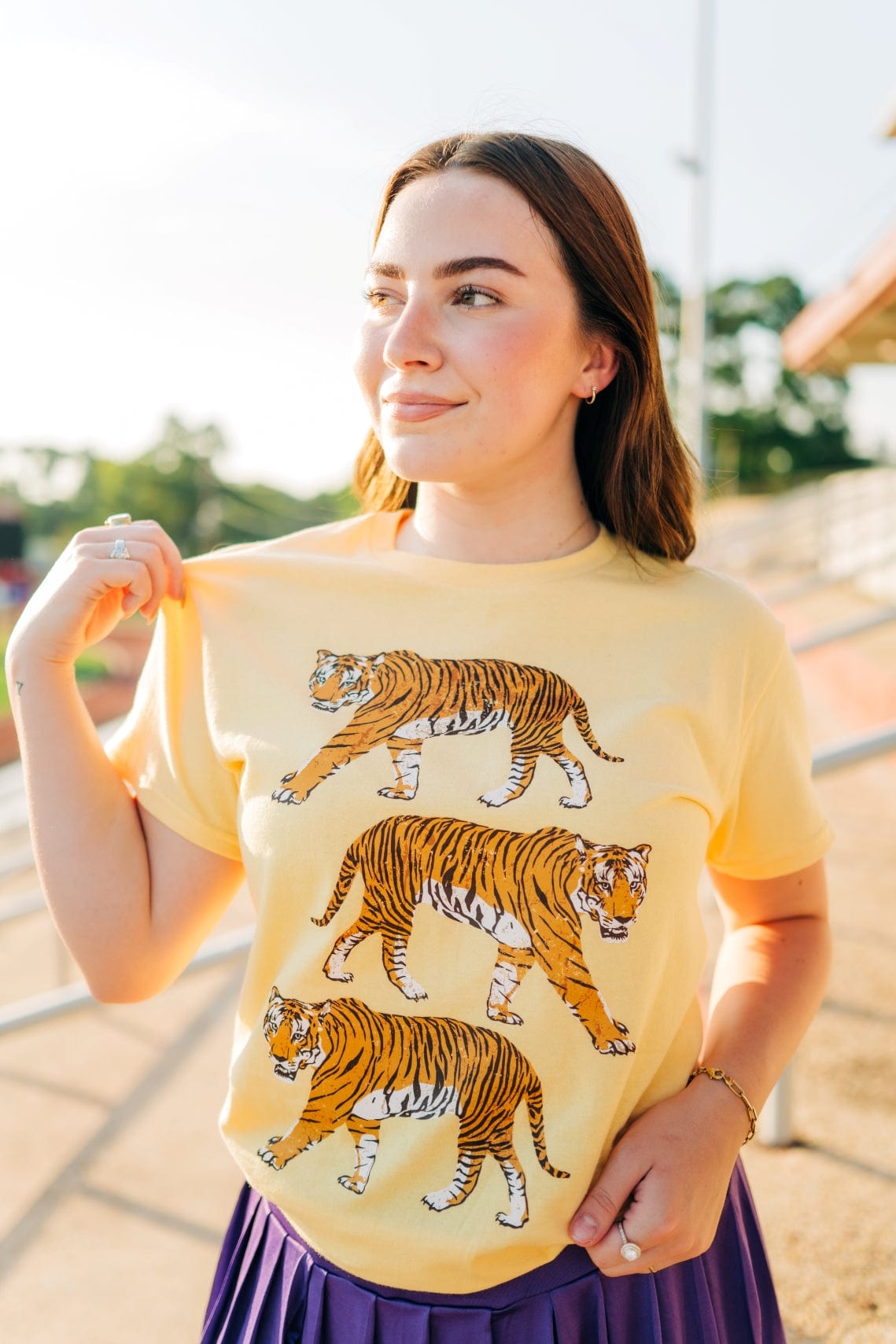 Show your LSU pride in comfort and style with the Yellow Retro Tiger Tee. This pale yellow tee features a bold tiger graphic on the front, combined with a relaxed fit and stretchy fabric for all-day wearability. The rounded neckline and short sleeves keep it casual and breathable, making it perfect for game days or everyday wear. Embrace your team spirit with a comfortable tee that moves with you.