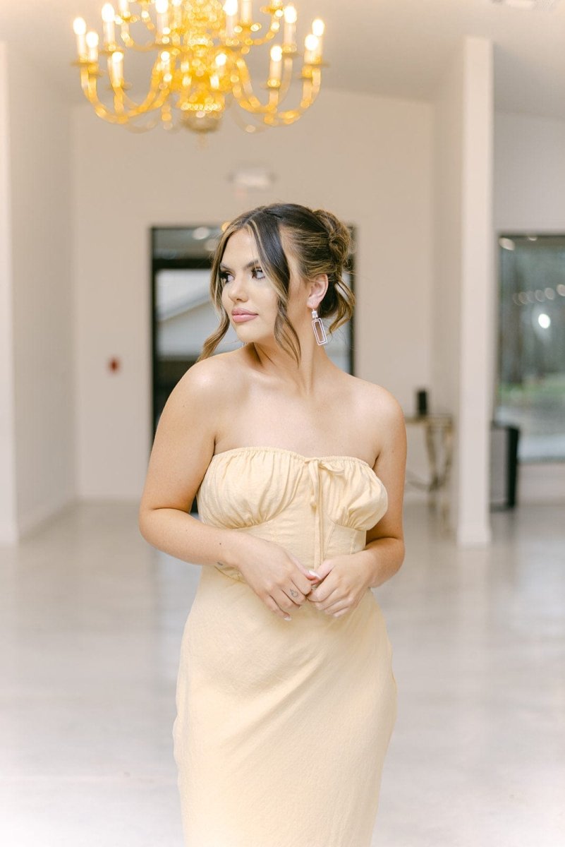 Elevate your wedding guest look with our Yellow Strapless Corset Midi Dress. The smocked back adds comfortable stretch, while the corset and front tie detail cinch your waist for a flattering silhouette. The midi length and side zip closure make it perfect for a night of dancing.